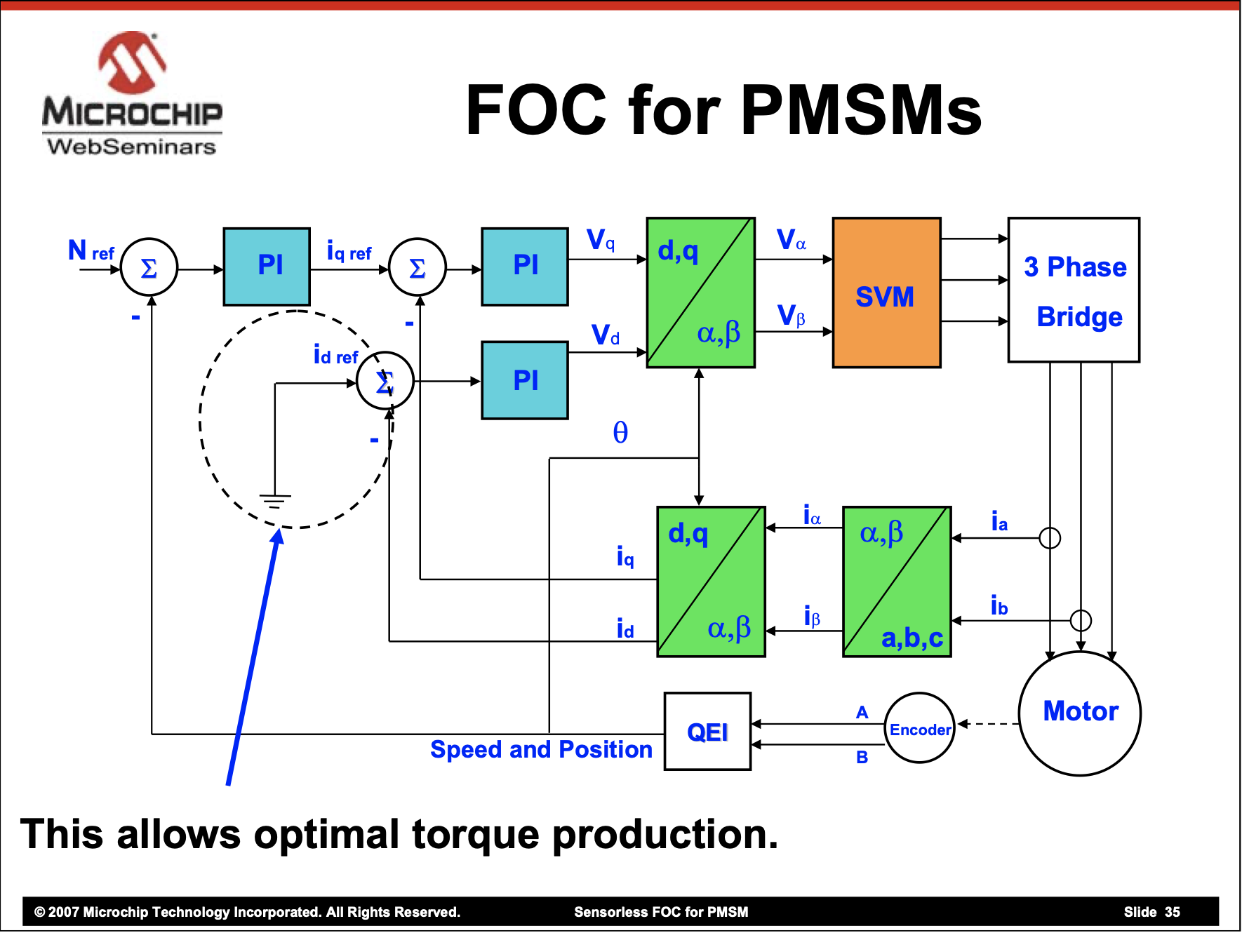 FEC is similar in structure to an inverted sensorless FOC. In sensorless FOC the motor currents are measured and a computed estimate of position is used in the FOC calculation. In the figures this segment is depicted in yellow. In FEC the motor position is measured and the motor currents are computed. This bypasses the forward Clark and Park computations as well as the PI controllers on iq and id. Thus, the computation for this algorithm is reduced by roughly half, allowing for simpler/cheaper microcontrollers or faster computation and switch times. Furthermore, by removing PI controllers on iq and id, FEC has a smaller delay and no current overshoot.