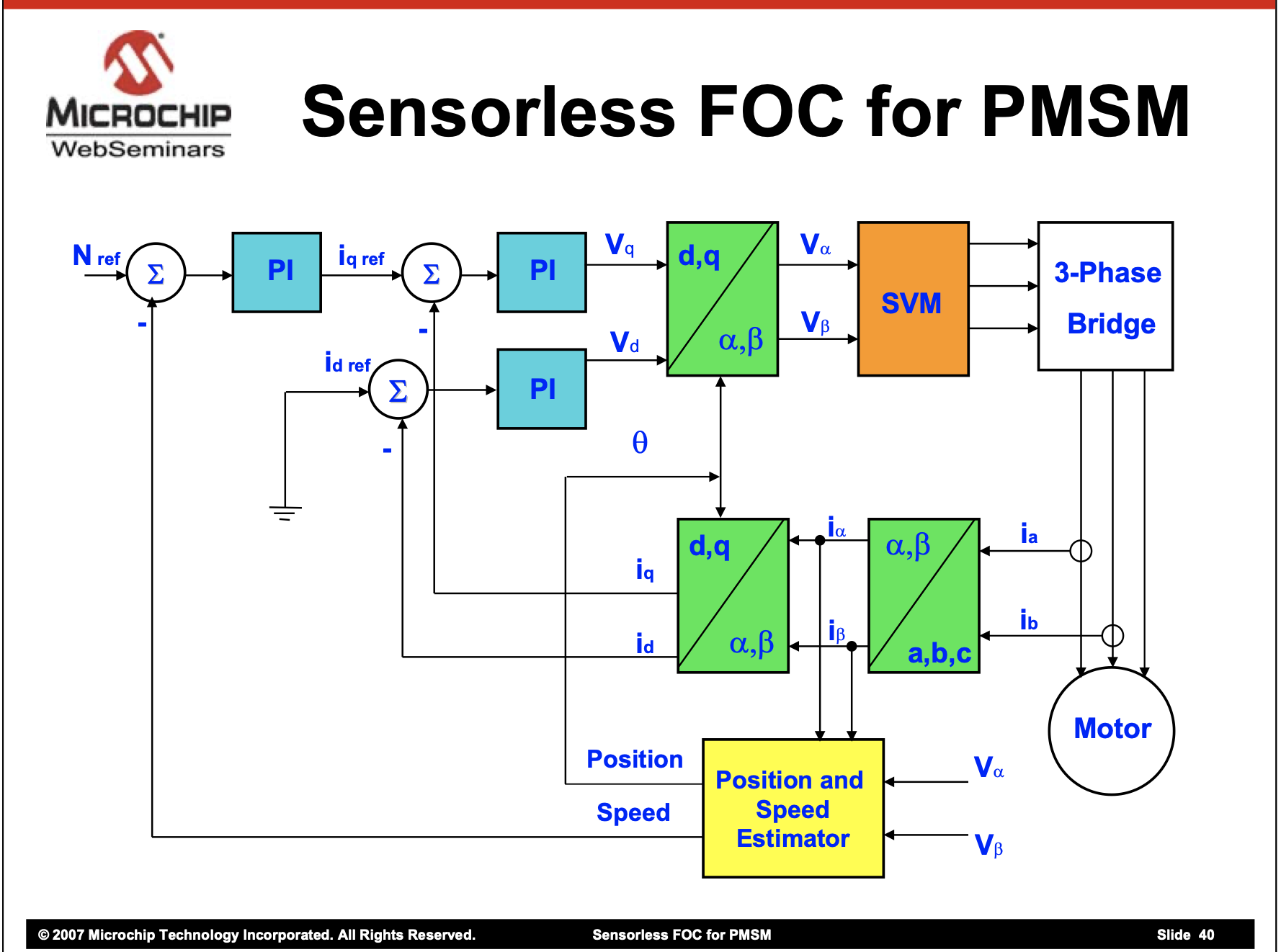 Sensorless FOC uses various computation based estimators to determine the rotor’s electrical position. First, the forward Clarke transformation is performed on the phase currents to determine the current vector in the stator frame. This vector is compared to the applied voltages in the stator frame and a detailed motor model is used to estimate the vector of the bEMF.