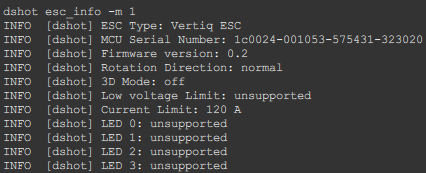 PX4 provides a mechanism to receive ESC information when using DSHOT with telemetry connected. Previous firmware versions did not respond correctly to this special DSHOT message. This update transmits the correct response message, and is now properly interpreted by the flight controller. The image below shows an example of this.